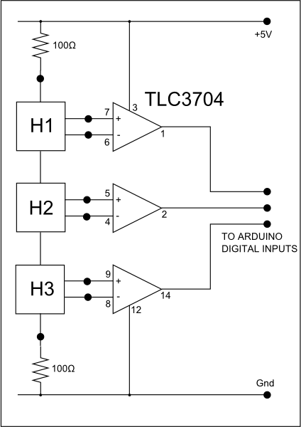 My plan was to utilise the three hall-effect sensors to sense rotation of the motor, but not rotation under power. Instead, I wanted to sense manual rotation of the CD-ROM hub. The voltage produced by a Hall-effect sensor is proportional to the strength of the magnetic field, but all we actually need in this circuit is to know its polarity. The polarity reverses each time the magnets in the rotating part of the motor go past a sensor. So, we can connect a comparator chip to the Hall-effect sensors, and since we can get quad comparator chips, one chip will be sufficient for all three sensors. I used a TLC3704, simply because I have lots of them that I got from FreeCycle. The comparator outputs will go from TRUE to FALSE and back again as the magnets rotate past the sensors. The three sensors are arranged by the design of the motor so that they go on and off in the following pattern: