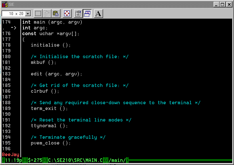 I was introduced to the Software Tools Subsystem on the Prime P750 at Westfield College (University of London) in 1981. We were all given login accounts on the Prime, which ran a multi-user operating system called Primos. But the college wanted a more Unix-like environment, so they installed Software Tools and told everybody to type ‘swt’ as soon as they had logged in. This started up Software Tools, and gave access to the Screen Editor. The Screen Editor was written as an improved version of the Software Tools line editor, ‘ste’. It accepted all the same commands as the line editor, but it displayed a full screen of text and gave much better feedback to the user. Remember that the first version of this program was written in 1980! Here at last is version 2.10 of the Software Tools Screen Editor, better known as se. I've finally got round to combining the eight different versions that have been lying around on various machines (and Exabyte tapes) for years! What I havn't yet done is to make any fixes or improvements to the code that'll happen in version 2.20. One very handy thing that this version includes is documentation in HTML. Not only can you read and print out se docs with your browser, you can read them on-line here. Without further ado, here are the source code archives: